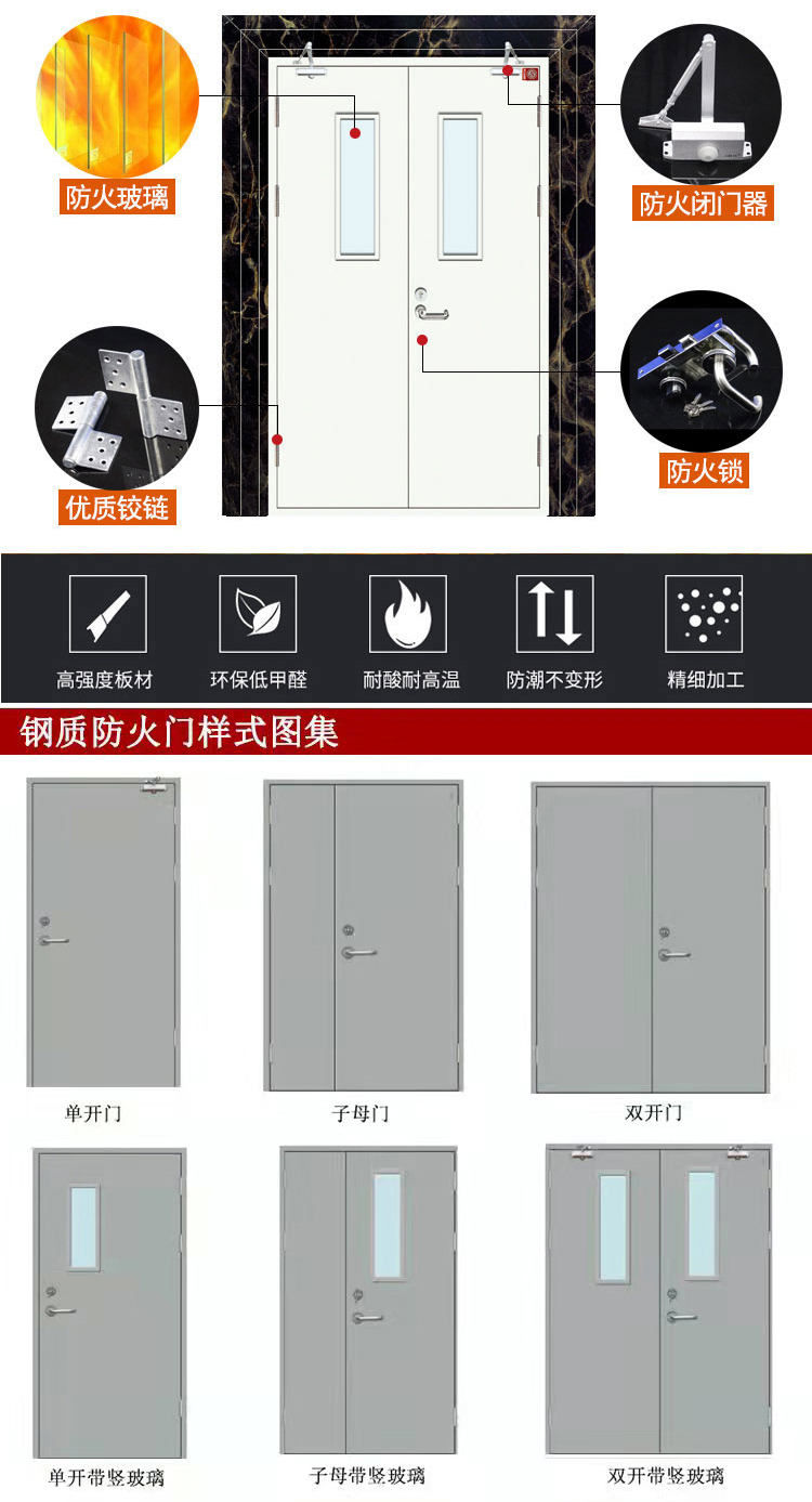 門框、門扇采用進(jìn)口或國產(chǎn)優(yōu)質(zhì)鍍鋅鋼板或304不銹鋼板制造,內(nèi)填耐高溫的優(yōu)質(zhì)珍珠巖防火材料,表面靜電噴塑處理,配套不銹